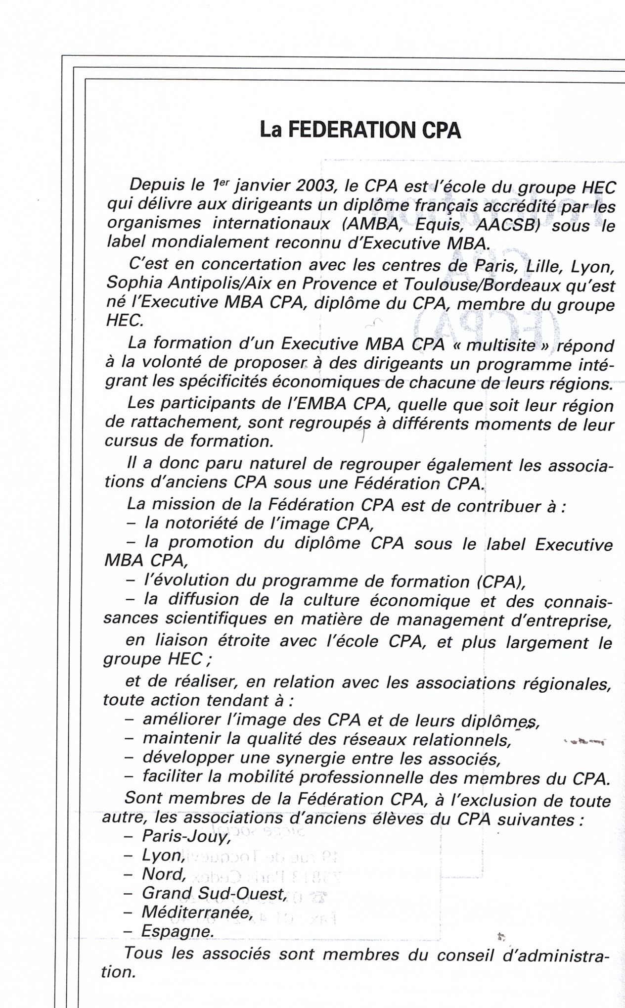 2) en ce qui concerne le fait que le C.P.A. est depuis 2002 un executive MBA de HEC, ceci est expliqué dans l'article Centre de perfectionnement aux affaires, et c'est encore mieux expliquée dans l'annuaire du C.P.A. sus-mentionné page 4 (4 premières lignes) dont scan ici : [6]. Ceci est également expliqué ici : [7]. Bon, il y a effectivement une petite erreur, c'est depuis le et non pas depuis 2002.